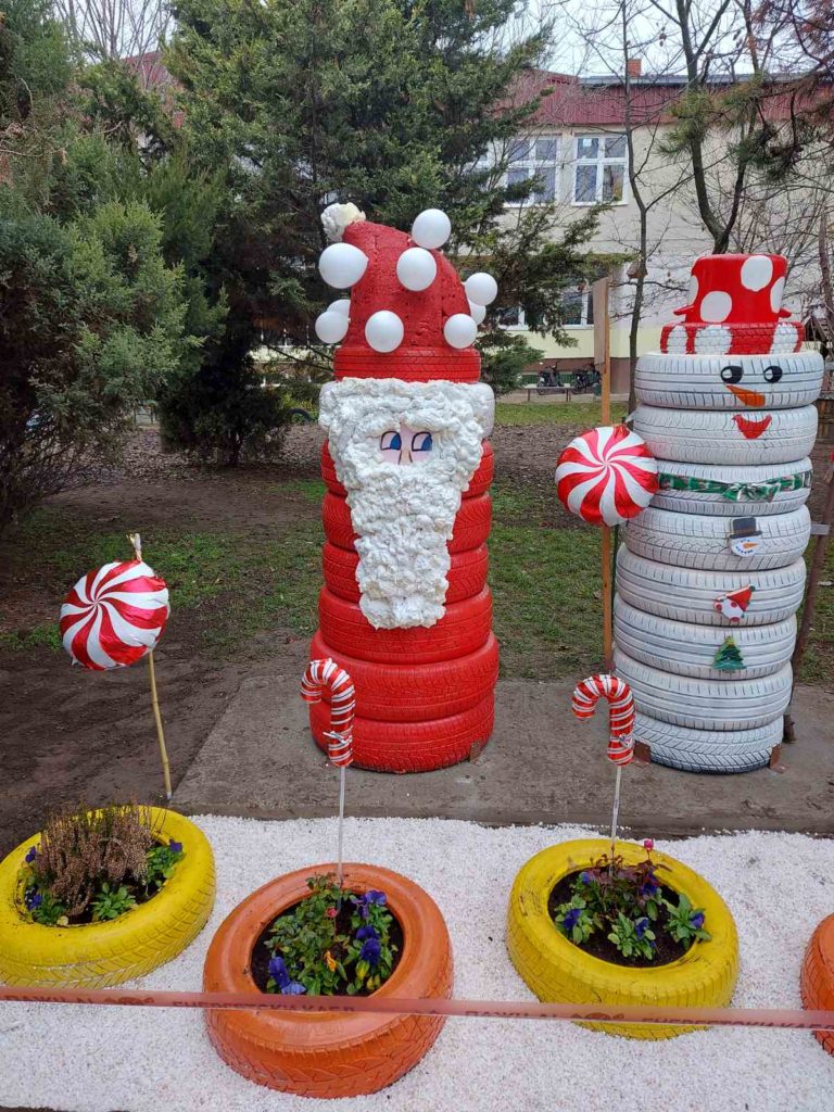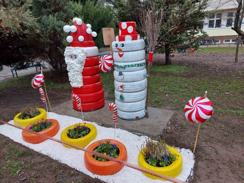 Школско двориште је украшено у празничком духу. Префарбане гуме претворене су у веселе ликове Деда Мраза и Снешка Белића, који су унели радост и топлину у простор школе и обрадовали ученике и посетиоце.